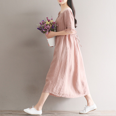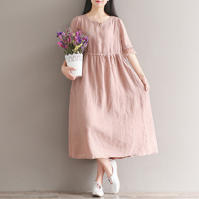 A New Short Sleeve Loose Size Women"s Cotton Hemp Dress With Hair Style In Spring And Summer Of